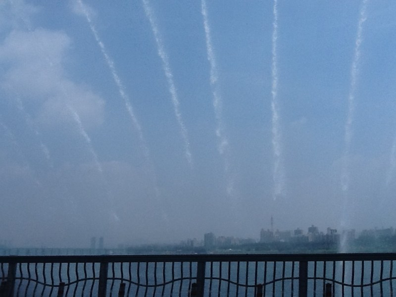 盤浦大橋の月光レインボー噴水。夜ならば七色の光が橋から川に落ちるような様子が楽しめる噴水です。昼間に、橋上の水が噴き出される下から撮影しました。この見方、気に入ってます。