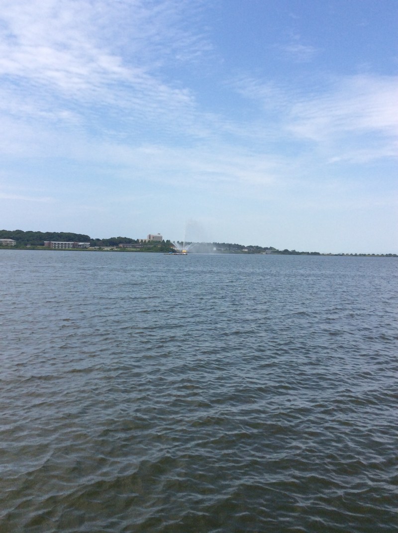 片山津温泉のシンボル、柴山潟で噴き上がる巨大噴水。子供たちを連れて見に行っています。