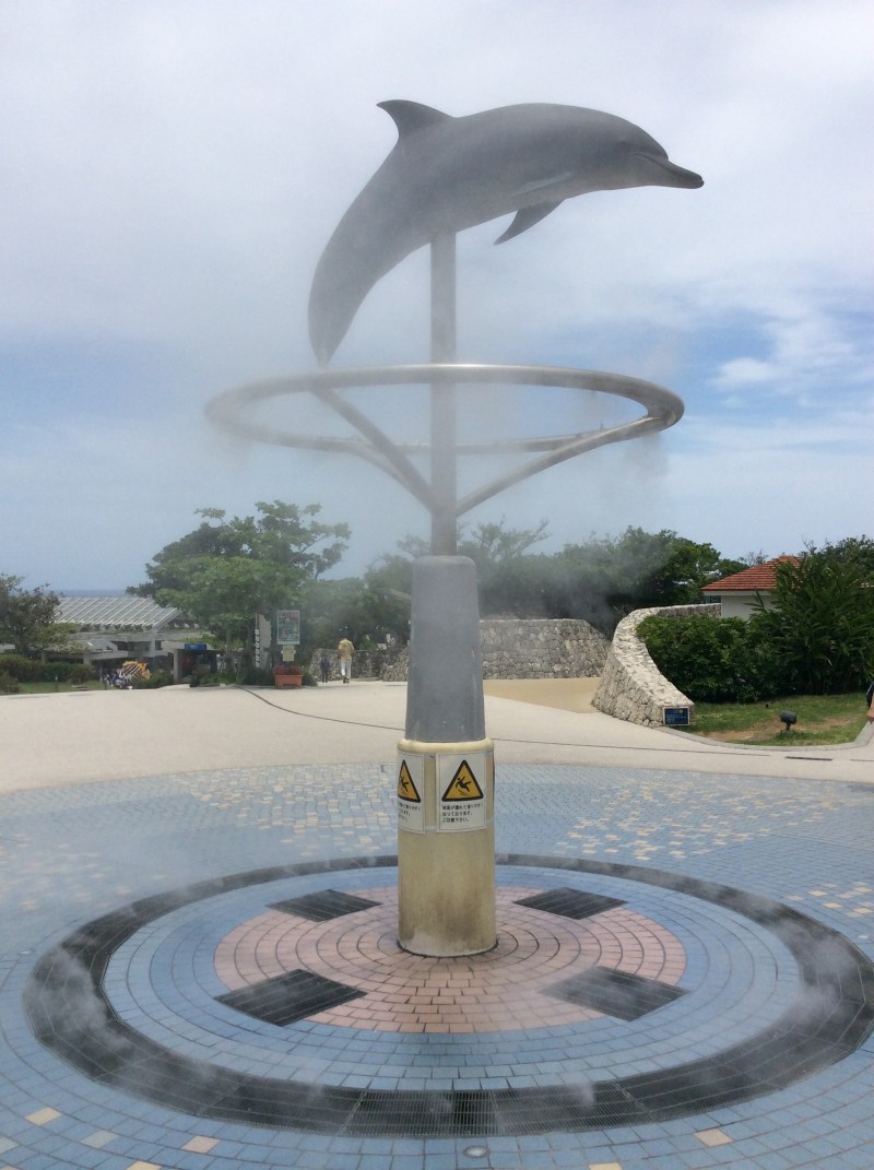 沖縄美ら海水族館の入り口だっかなぁ。。。イルカが空を泳いでいるようでした。